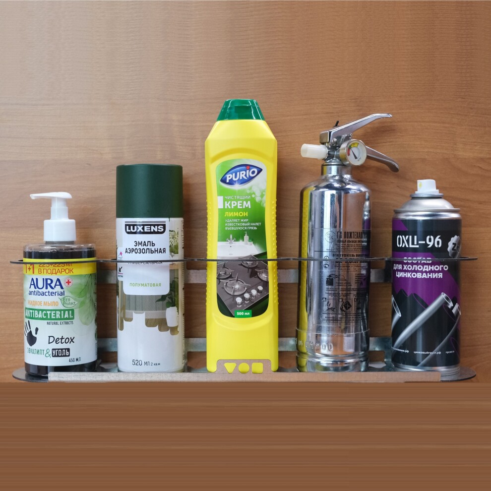 Изготовлен из оцинкованной стали толщиной 2 мм. Конструкция удобна тем, что практически не скрывает надписи и обозначения на размещенных ёмкостях, что важно для безопасного хранения.