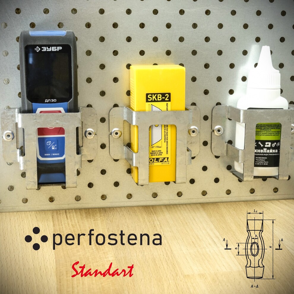Держатель устанавливается на две вытяжные алюминиевые заклёпки 4х6 на перфорированую панель системы размещения инструментов perfostena. Так же его можно установить с помощью саморезов с плоским прижимом на любые другие поверхности.
