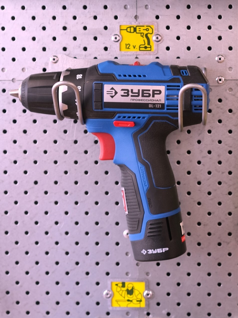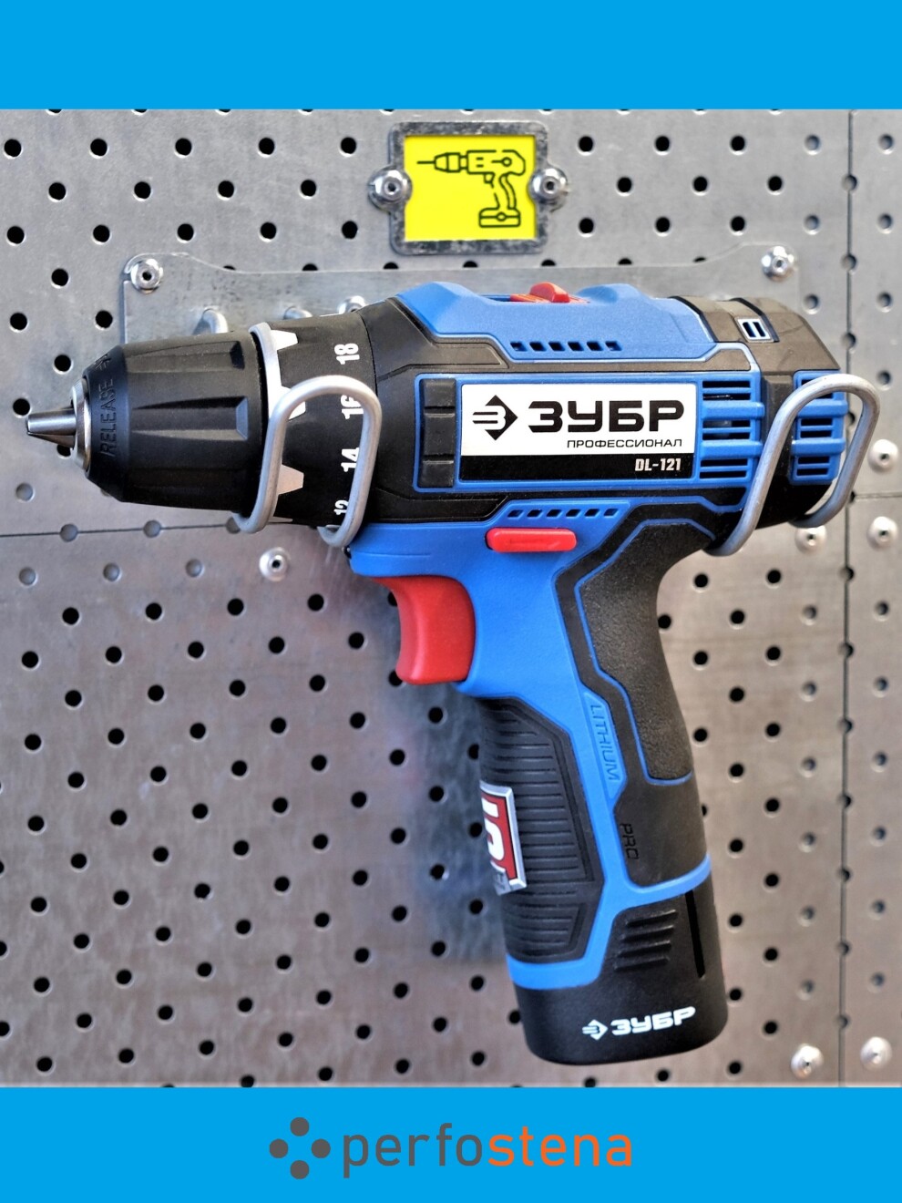 Держатель для шуруповерта изготовлен из оцинкованной стали. Прочная и удобная конструкция рассчитана на эксплуатацию в производственных условиях. Используется как в составе системы размещения инструмента perfostena, так и без неё. В составе системы крепится алюминиевыми вытяжными заклёпками 4 х 6 мм. на перфорированную панель. На другие поверхность крепится стандартными саморезами с плоским прижимом.