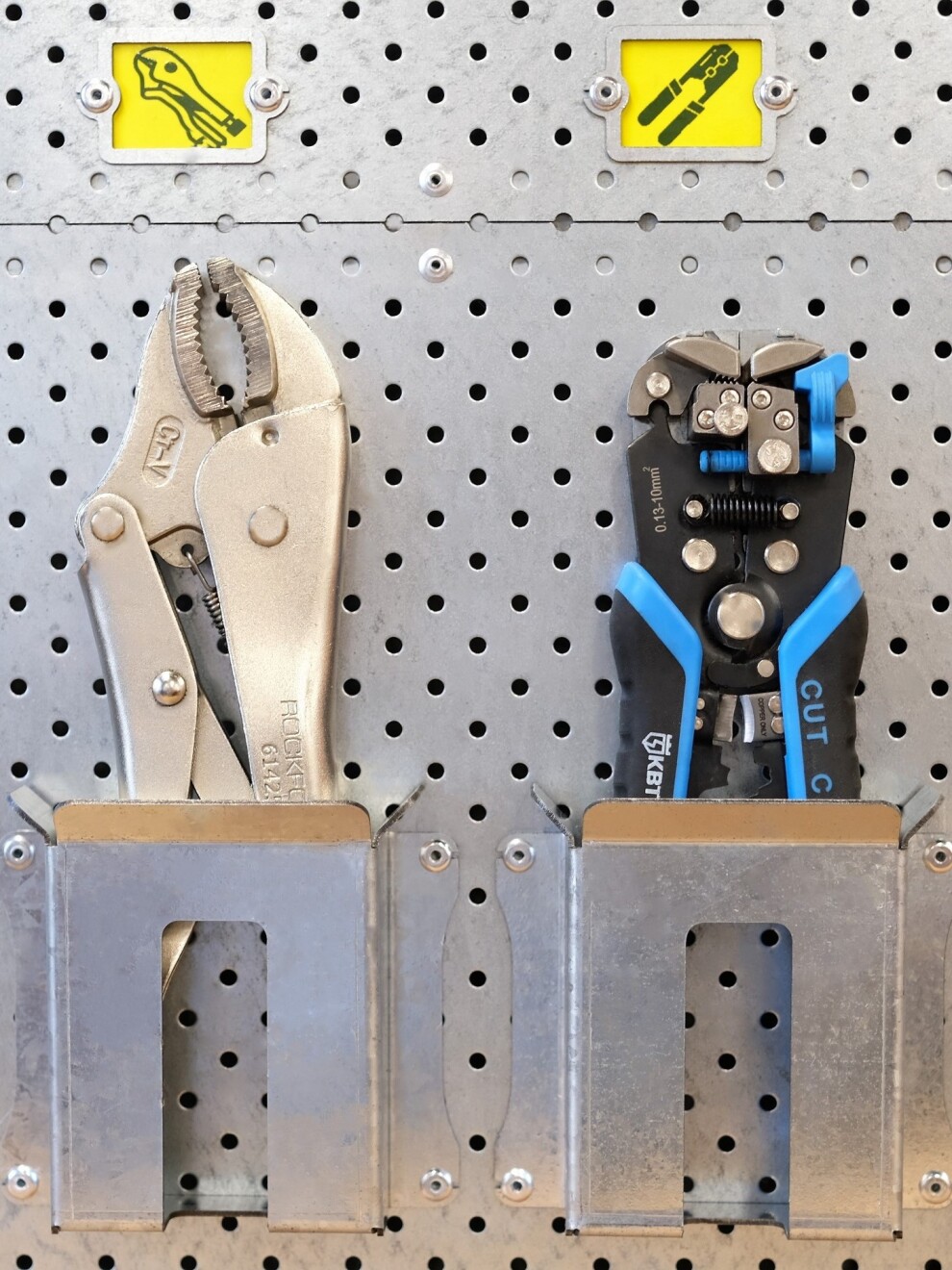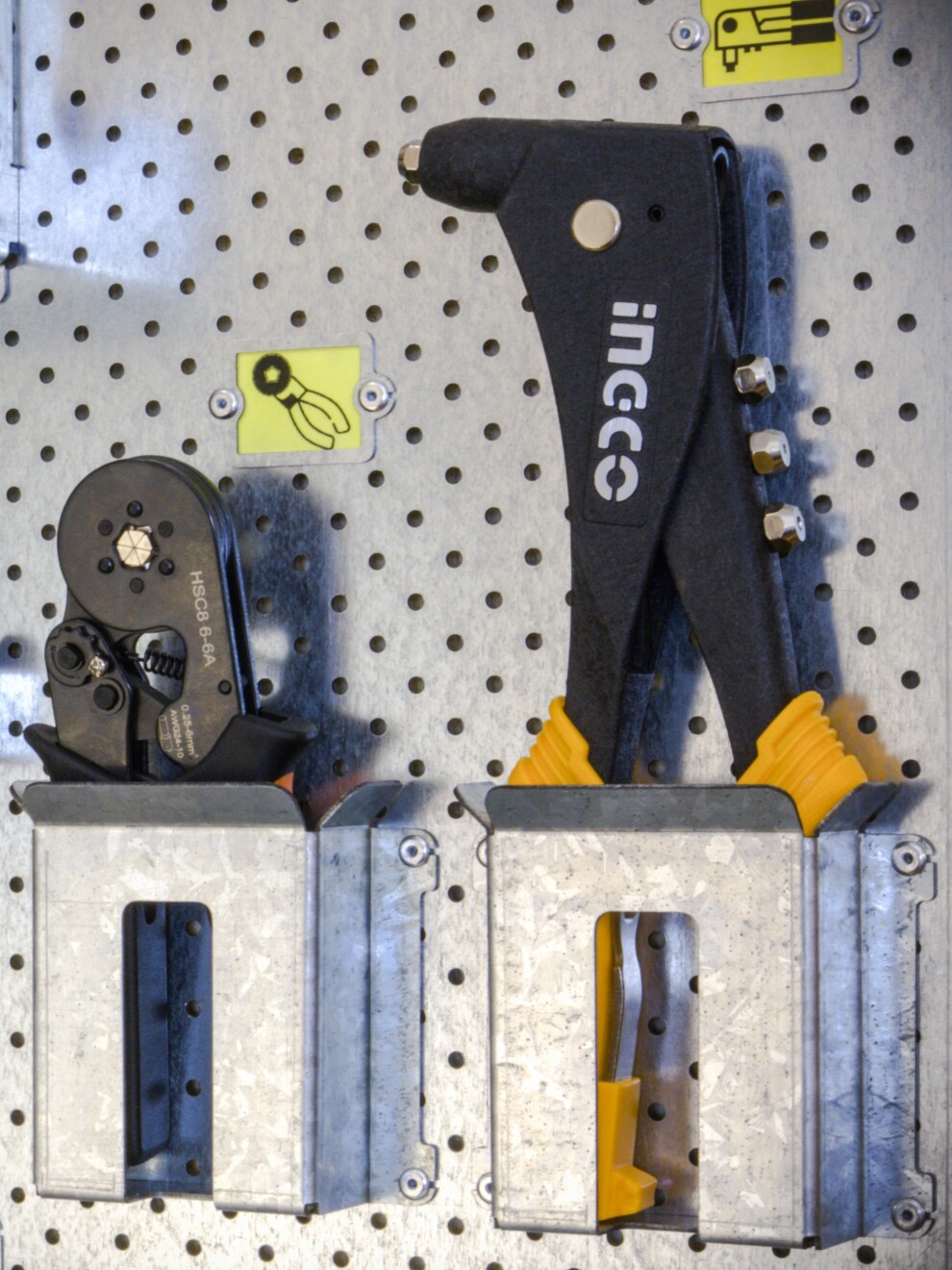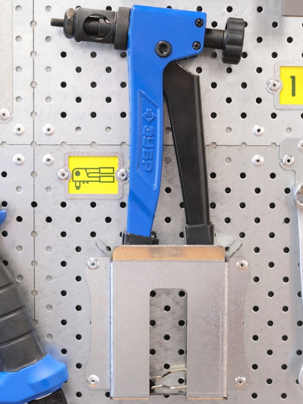 размещения инструмента perfostena, так и без неё. В составе системы крепится алюминиевыми вытяжными заклёпками 4 х 6 мм. на перфорированную панель. На другие поверхность крепится стандартными саморезами с плоским прижимом.
