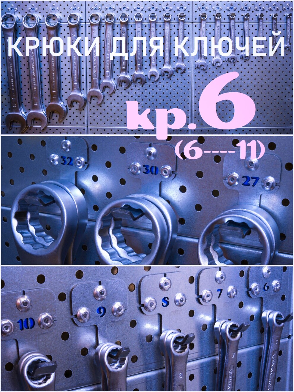 Всего 6 Крюков для метрических малоразмерных комбинированных ключей от 6 до 11 мм. Расчитаны на профессиональное размещение - по два одинаковых ключа на один крюк.